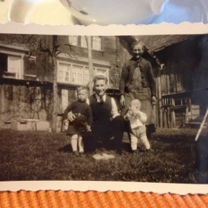 After Davos we headed to the Rheintal, where Mum and Dad grew up. Again we had a nice time with the relatives. Some of the ‘angst’ I feel about seeing them is a hangover from my time when I was 20 and I stayed with my Oma, who sometimes had a very small-village mindset. Lipstick was definitely out, as were my home made flairs (though I am now with her on that one). We had lots of chats about the past and one uncle produced an old photo of Dad (that is him on the left – see below)